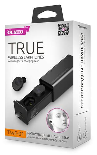 | Комплектация | Наушники Olmio TWE-01 / 2 пары сменных амбушюр / Кабель для зарядки футляра - 1 шт / Зарядная станция-футляр - 1 шт / Документация |