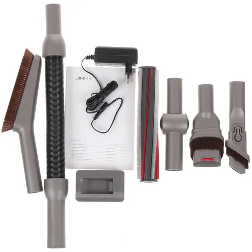 | Комплектация | Пылесос вертикальный Jimmy JV65 Graphite+Red с зарядным устройством ZD24W342060EU / Адаптер - 1шт / Держатель - 1шт / Коннектор - 1шт / Насадки - 6шт / Турбощетки - 2шт / Документация |