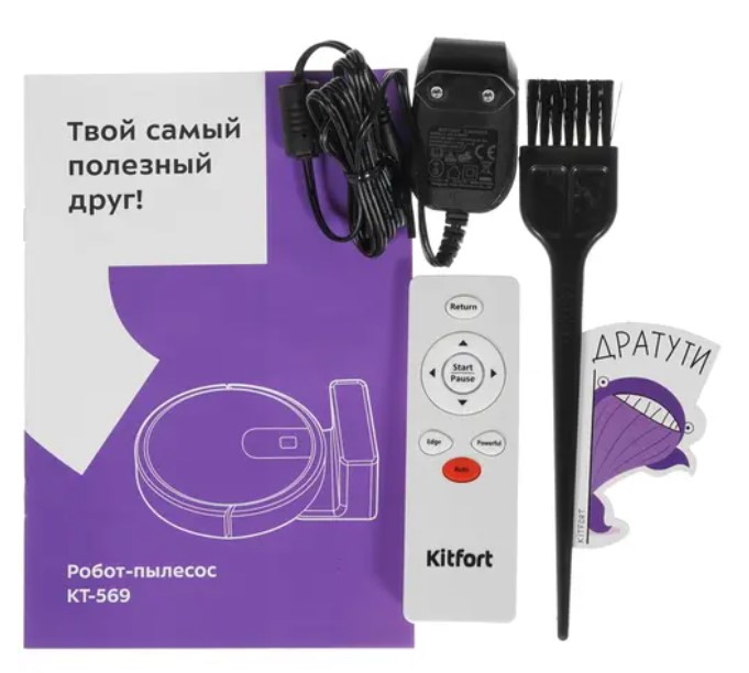 | Комплектация | Пылесос-робот Kitfort KT-569 чёрный / Фильтр грубой очистки - 1 шт. / Щеточка для очистки - 1 шт. / HEPA-фильтр- 1 шт. / Губчатый фильтр- 1 шт. / Документация |