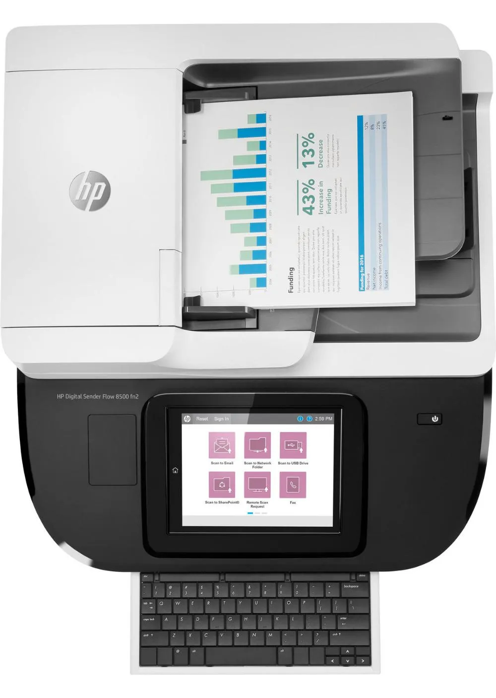 Сканер HP Digital Sender Flow 8500 Fn2 изготавливается в прочном и долговечном корпусе из пластикового полимера. Для удобной настройки параметров и обработки сканов имеется яркий крупный дисплей, а также выдвижная клавиатура. Работает с локальной сетью предприятия по кабелю RJ-45. Также поддерживает возможность подключения к компьютерным системам по кабелю USB 2.0.