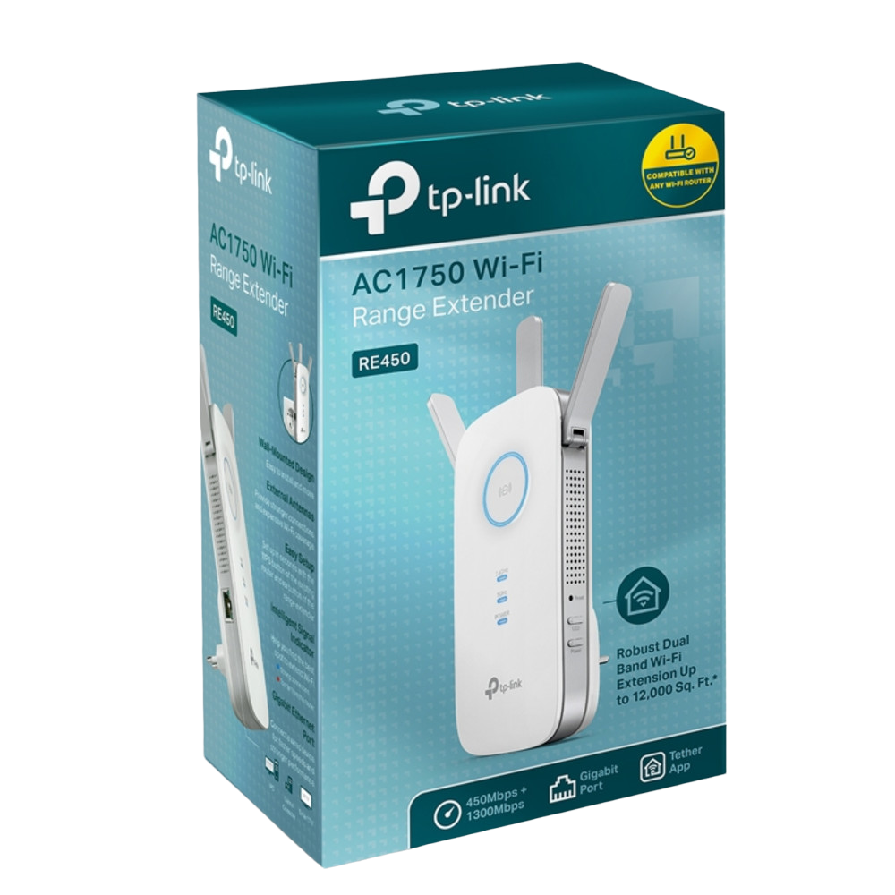 Усилитель TP-Link RE450 изготавливается с небольшим корпусом из пластикового полимера с окраской в белый цвет. Предусмотрены светодиодные индикаторы состояния подключения. Для подключения к локальной сети предусмотрен стандартный интерфейс RJ-45 с предельной пропускной способностью 1000 Мбит/с.