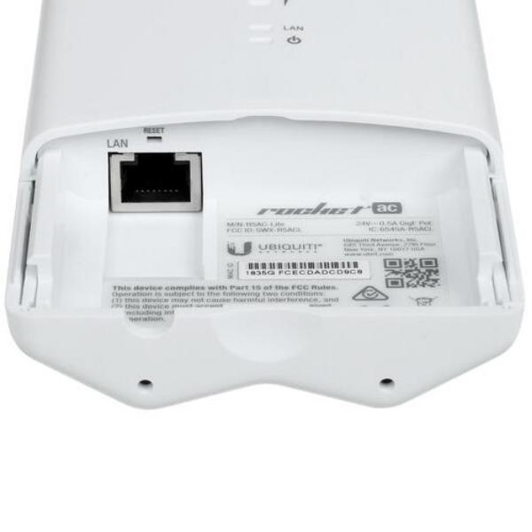 Точка доступа Ubiquiti Rocket AC Lite R5AC-LITE изготовлена в небольшом долговечном корпусе из пластикового полимера, окрашенного в белый цвет. Поддерживает возможность установки на различные штанги и столбы. Для подключения к локальной сети используется стандартный разъем RJ-45, работающий на скорости до 1000 Мб/с. Требует подачи электропитания по единому кабелю с системой PoE.