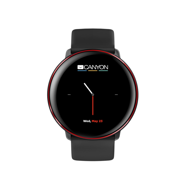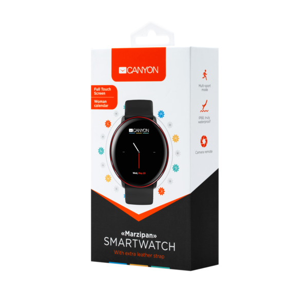 Умные часы Canyon Marzipan SW-75 черного цвета привлекает внимание своим минималистичным и ультратонким дизайном. У часов классический круглый циферблат, полностью сенсорный экран с диагональю 1.22 дюйма. Корпус из алюминия прочен, но легок. В комплект к часам входят два ремешка – кожаный и силиконовый, которые вы сможете менять в зависимости от обстоятельств и настроения.
