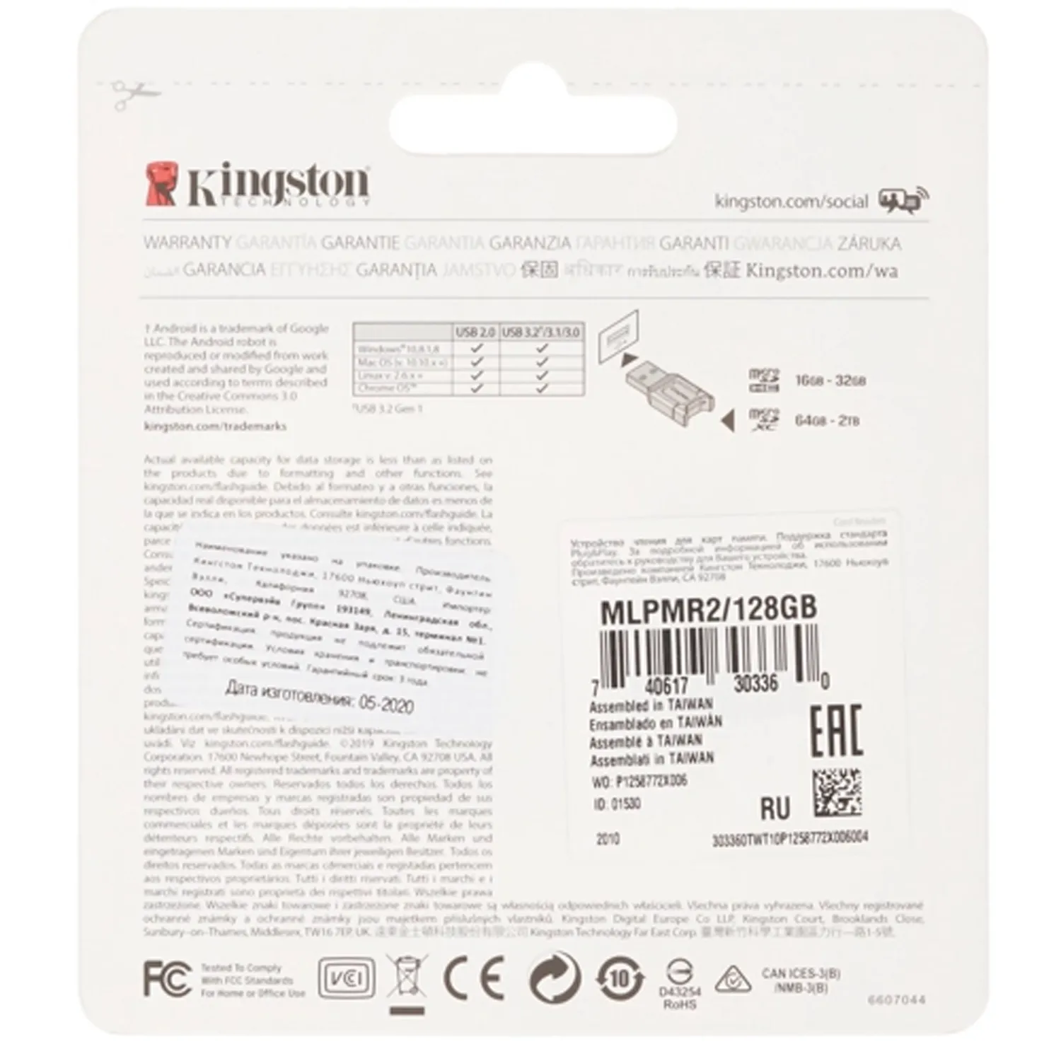 представляет собой карту памяти. Модель MLPMR2/128GB имеет адаптер для microSD интерфейса. Оборудование Kingston MLPMR2128GB имеет объем в 128 ГБ.