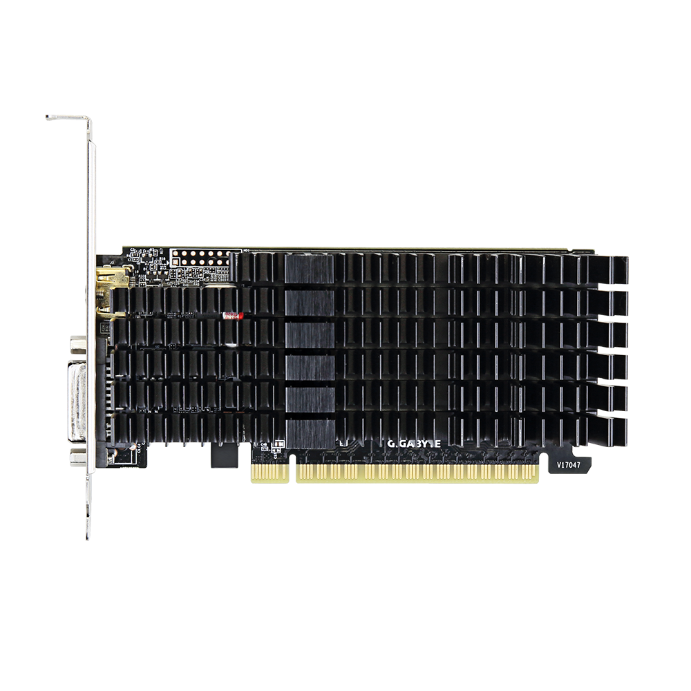 Видеокарта Gigabyte GT 710 GV-N710D5SL-2GL с пассивным охлаждением предназначена для установки в полностью бесшумные компьютеры начального уровня производительности для офисных работ, домашнего использования, а также в закрытых терминалах. Имеются 2 цифровых вида подключения мониторов и телевизоров: DVI-I и HDMI. Чтобы подключить устаревший VGA монитор, необходимо дополнительно приобрести конвертер.