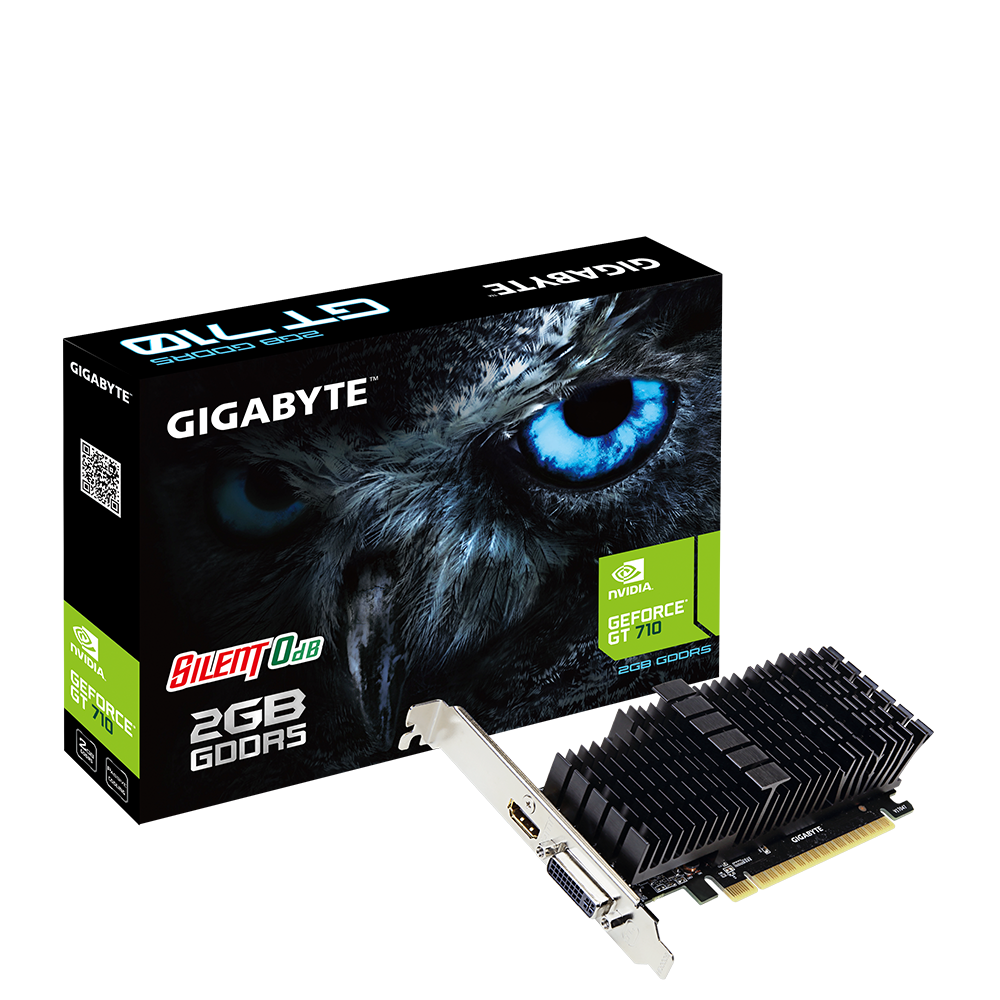 Оснащение 2 ГБ скоростной GDDR5 памяти с частотой 5010 МГц обеспечит работу в браузерах, простых графических редакторах, просмотр видео и кинофильмов. Gigabyte GT 710 не предназначена для современных видеоигр, но вполне комфортно позволит играть в классические старые игры.