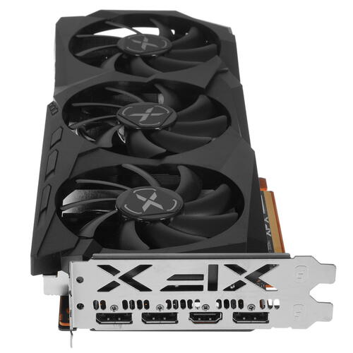 Длина модели 304 мм. Конструкция видеокарты включает в себя мощную систему активного охлаждения с помощью радиатора и трех вентиляторов. Система охлаждения занимает 2 слота. Благодаря ей обеспечивается стабильная работа устройства при высоких нагрузках. Видеокарта подключается к материнской плате через интерфейс PCI Express 4.0 x16 и 2 разъема питания 8pin. Устройство рекомендуется устанавливать в системы с блоком питания не меньше 650 Вт.