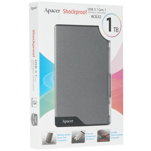Внешний жесткий диск HDD Apacer AC632 может в значительной мере увеличить эффективность и производительность компьютера, а также используется с целью переноса данных с одного устройства на другое, обеспечивая при этом высокую надежность. Модель представлена в стильном сером дизайне, подходящим под любую обстановку рабочего стола. Объем накопителя составляет 1024 Гб. Корпус оснащен защитой от царапин и ударов и выполнен из высококачественного металла с добавлением алюминия, что в паре обеспечивает максимально высокую ударопрочность и износостойкость, повышая долговечность эксплуатации. Интерфейс подключения USB 3.2 Gen 1 Type A обеспечивает высокую скорость передачи данных и простое подключение.